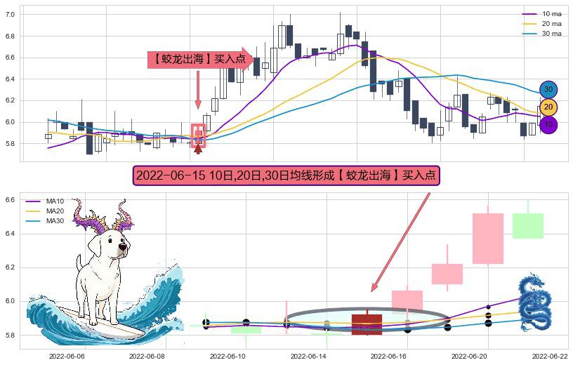 形态多维评估: ⚀ 2022-06-15日显现 10日-20日-30日均线 【蛟龙出海】买入点 看多信号,后市看涨,买入