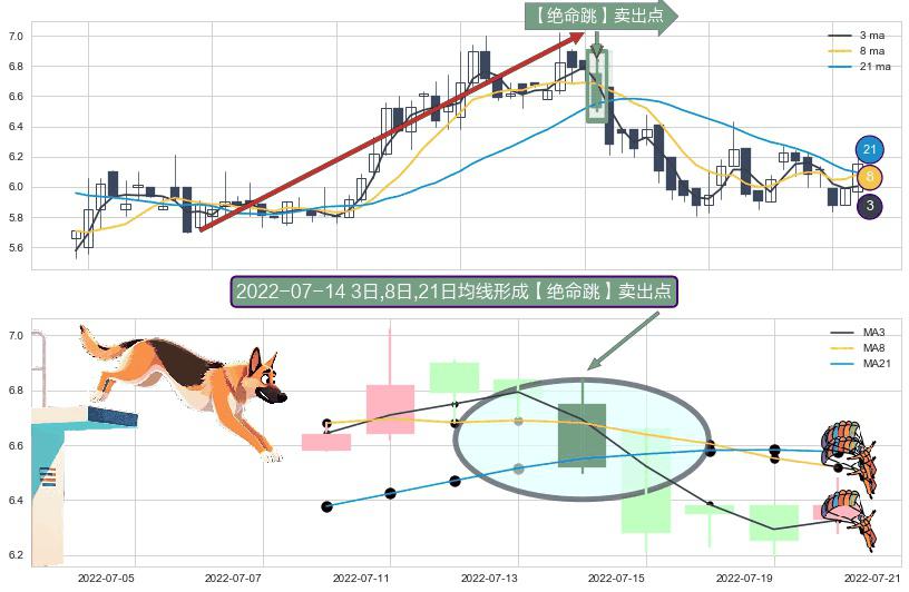 形态多维评估: ⚀ 2022-07-14日显现 3日-8日-21日均线 【绝命跳】卖出点 看空信号,后市看跌,卖出