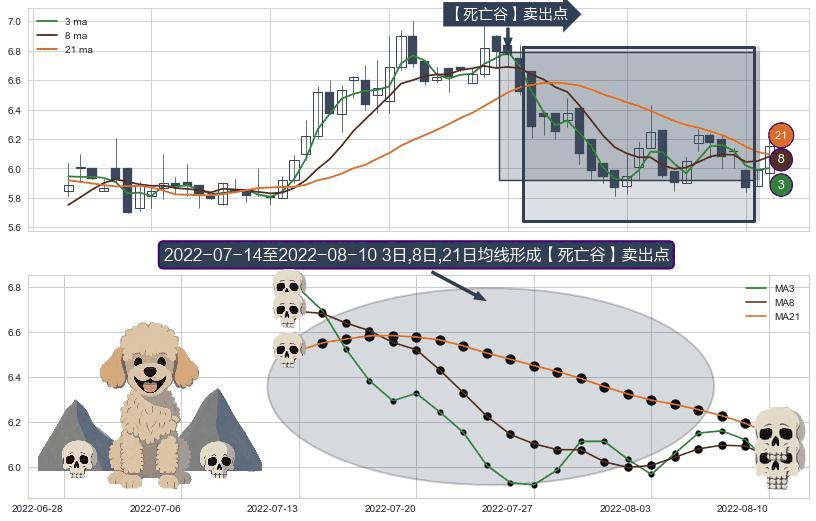 形态多维评估: ⚀ 2022-07-15-日至2022-08-10-日显现 3日-8日-21日均线 【死亡谷】卖出点 看空信号,后市看跌,卖出