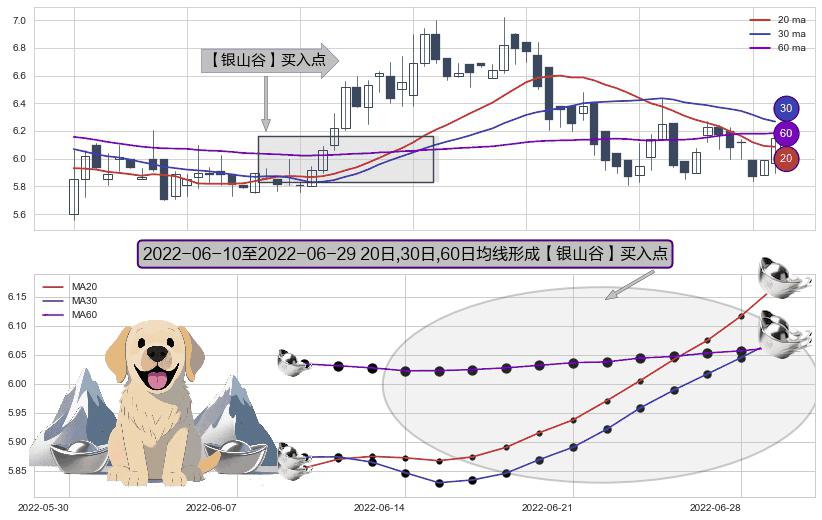 形态多维评估: ⚀ 2022-06-13-日至2022-06-29-日显现 20日-30日-60日均线 【银山谷】买入点 看多信号,后市看涨,买入