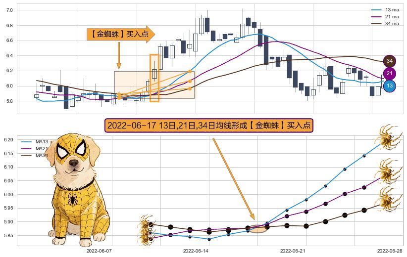 形态多维评估: ⚀ 2022-06-17日显现 13日-21日-34日均线 【金蜘蛛】买入点 看多信号,后市看涨,买入