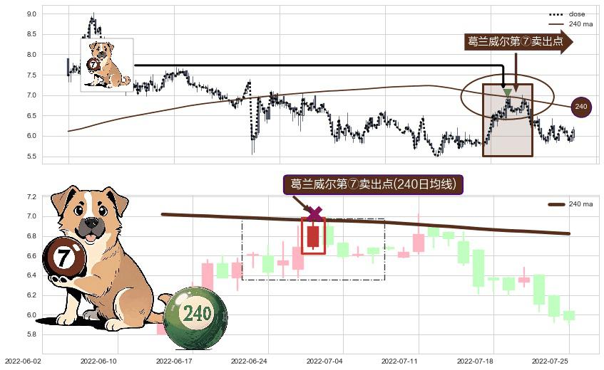 形态多维评估: ⚀ 2022-06-29-日显现 葛兰威尔均线 240日均线 第⑦卖出点 下降趋势的中继信号,后市看跌,卖出信号