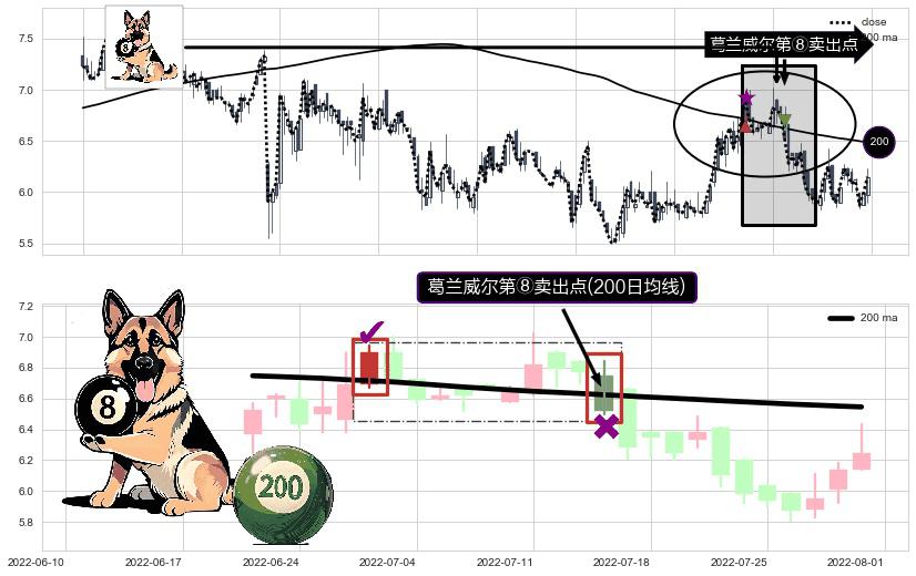 形态多维评估: ⚀ 2022-07-14-日显现 葛兰威尔均线 200日均线 第⑧卖出点 下降趋势的中继信号,后市看跌,卖出信号
