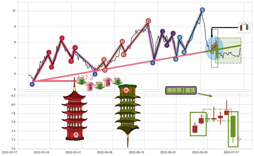 ➣ 2021-08-19-2022-06-15上升趋势存在反转[风险],虽然原上升趋势的支撑位(7.79)已破位,但其支撑效果尚存,原上升趋势角度: 27.2˚