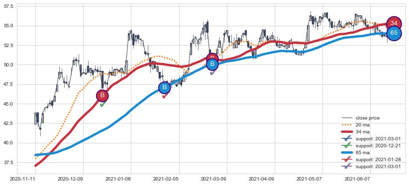 ⚁ MA3和MA8走势平行,且始终保持在短距离内,MA21始终在短中期均线下方,与短中期均线保持一定的距离,微微上行
