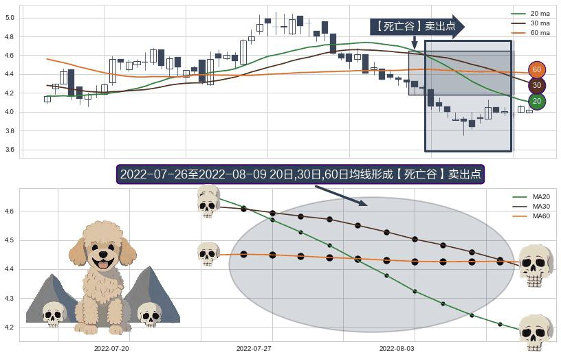 ⚀ 2022-07-27-日至2022-08-09-日显现 20日-30日-60日均线 【死亡谷】卖出点 看空信号,后市看跌,卖出