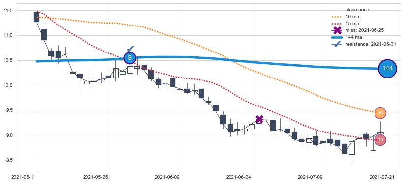 下跌趋势2021-05-11-2021-07-21,均线144确认关键阻力1处