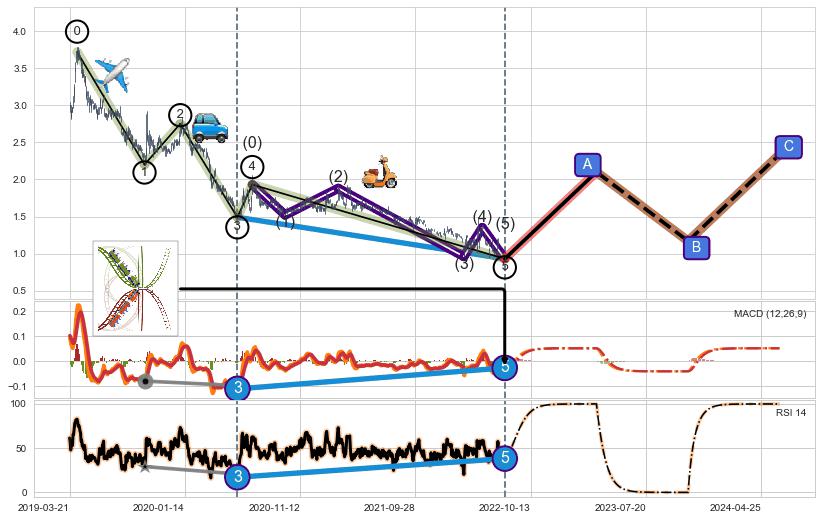 ➣ 第一, 三, 五浪下跌动能逐渐【衰弱变小】,趋势呈现不稳迹象