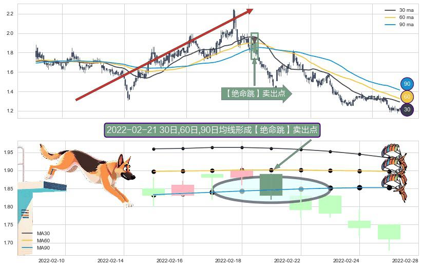 形态多维评估: ⚀ 2022-02-21日显现 30日-60日-90日均线 【绝命跳】卖出点 看空信号,后市看跌,卖出