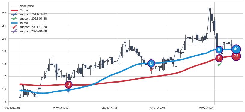 上涨趋势2021-09-30-2022-02-09,均线40, 75确认关键支撑3处