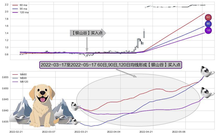 形态多维评估: ⚀ 2022-03-18-日至2022-05-17-日显现 60日-90日-120日均线 【银山谷】买入点 看多信号,后市看涨,买入