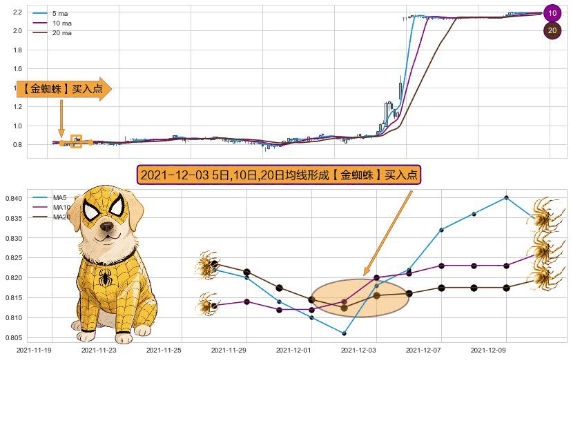 形态多维评估: ⚀ 2021-12-03日显现 5日-10日-20日均线 【金蜘蛛】买入点 看多信号,后市看涨,买入