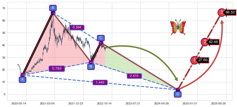 ➣ 未完成【蝴蝶】形态起点X: 2020-04-02, 已到达C点: 2022-06-28, 预测最终D点: 2024-07-23, 共1087交易日