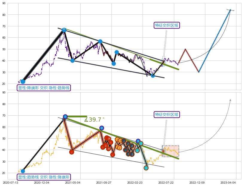 | 2 🅚:降势受阻 ➕ 📐:降旗形向上突破击穿阻力位, 猜想持续拉升上涨,被突破的阻力位已变为支撑位 ☞ 看多信号 ⇥ 【🅚线】交织【图形】⇥ 综合量化分数: 51 | > |