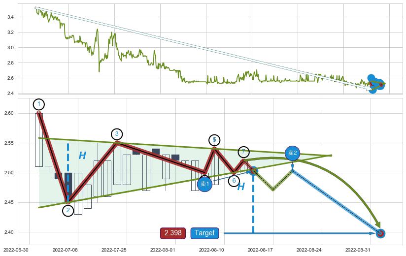 ➣ 【未确认突破,预测即将形成突破】下降【对称】三角形整理起点:2022-07-04, 预测突破点:2022-08-15,形态共23交易日