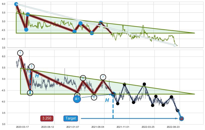 ➢ 【多方力量耗尽,空方打破攻守平衡点】下降三角形中继整理, 已在2021-07-27突破【支撑】颈线 4.33 →演变成下降通道