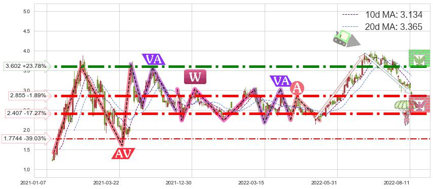 ♘ 支撑价格位2.855,可信任强度87.58%,距离最后交易2022-08-12形成的收盘价格2.910相差 -1.89%