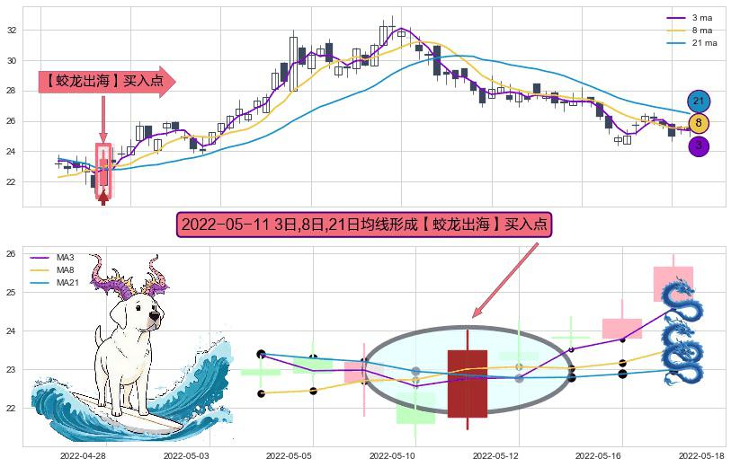 ⚀ 2022-05-11日显现 3日-8日-21日均线 【蛟龙出海】买入点 看多信号,后市看涨,买入