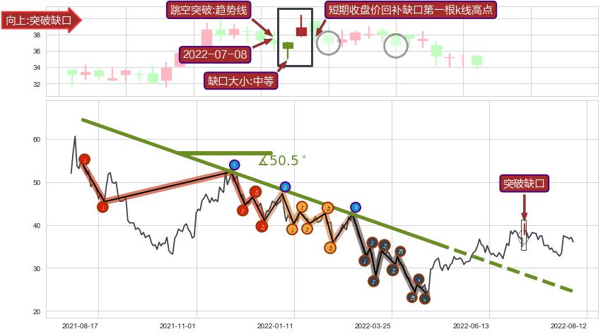 ➢ 突破缺口形成后,后续k已经超过14根,跳空突破趋势线关键点后, 出现【完全回踩】迹象,短期收盘价回补缺口第一根k线高点