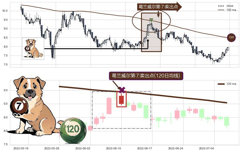 形态多维评估: ⚀ 2022-06-10-日显现 葛兰威尔均线 120日均线 第⑦卖出点 下降趋势的中继信号,后市看跌,卖出信号
