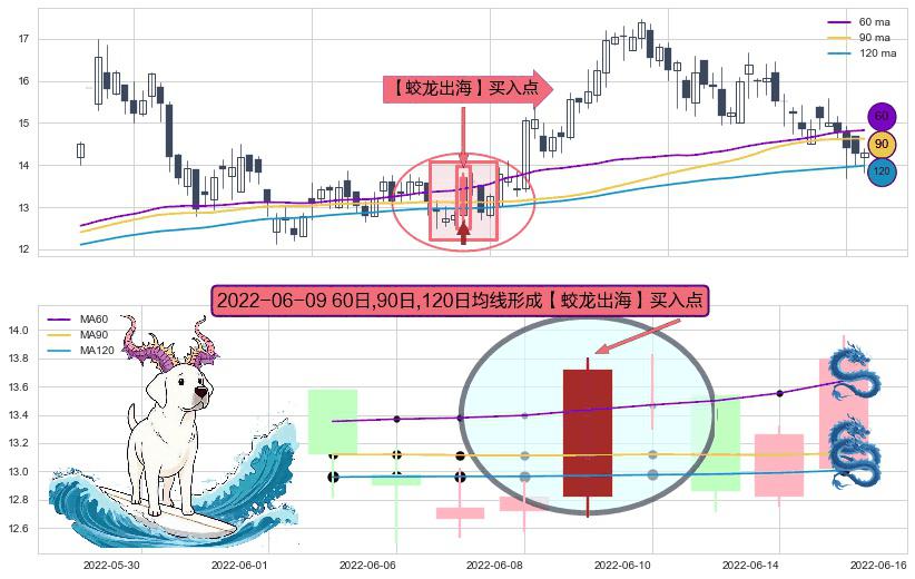 ⚀ 2022-06-09日显现 60日-90日-120日均线 【蛟龙出海】买入点 看多信号,后市看涨,买入