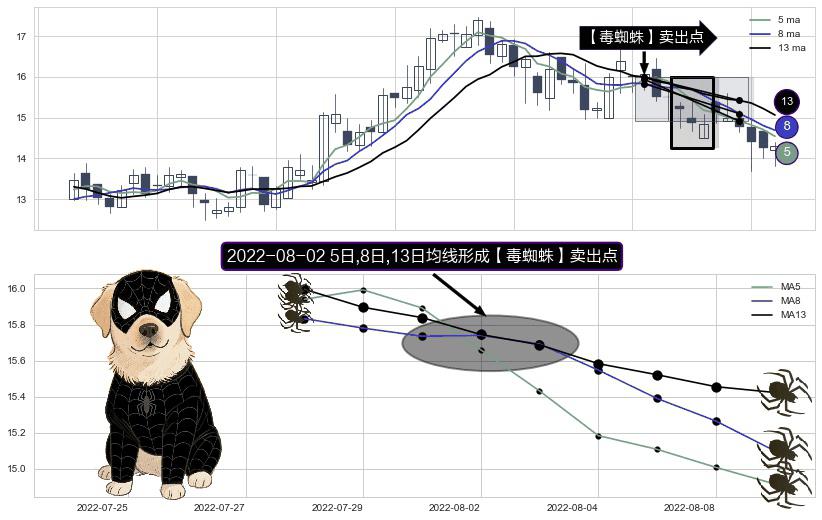⚀ 2022-08-02日显现 5日-8日-13日均线 【毒蜘蛛】卖出点 看空信号,后市看跌,卖出