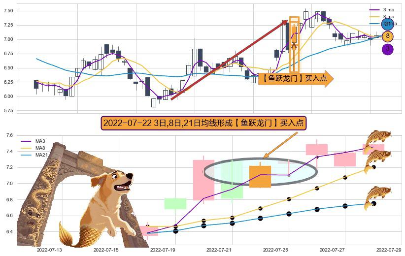 ⚀ 2022-07-22日显现 3日-8日-21日均线 【鱼跃龙门】买入点 看多信号,后市看涨,买入