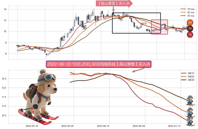 ⚀ 2022-05-27日-2022-07-15日显现 10日-20日-30日均线 【高山滑雪】买入点 看多信号,后市看涨,买入