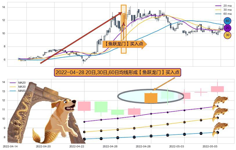 ⚀ 2022-04-28日显现 20日-30日-60日均线 【鱼跃龙门】买入点 看多信号,后市看涨,买入