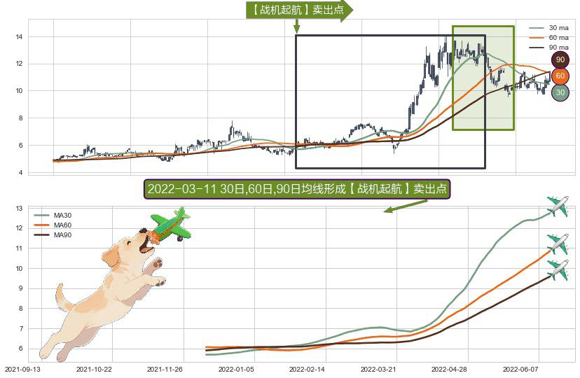 ⚀ 2021-12-08日-2022-06-13日显现 30日-60日-90日均线 【战机起航】卖出点 看空信号,后市看跌,卖出