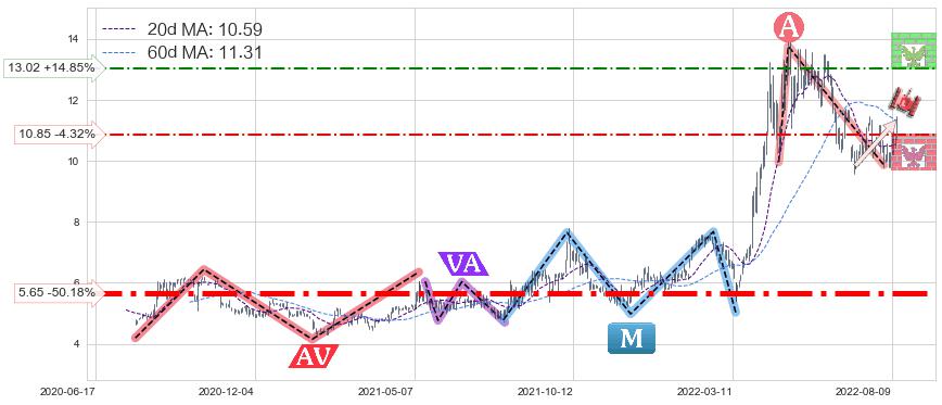 ♘ 支撑价格位10.85,可信任强度43.17%,距离最后交易2022-08-12形成的收盘价格11.34相差 -4.32%