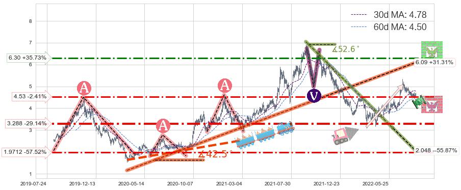 ♘ 阻力价格位6.30,可信任强度63.49%,距离最后交易2022-08-12形成的收盘价格4.64相差 +35.73%