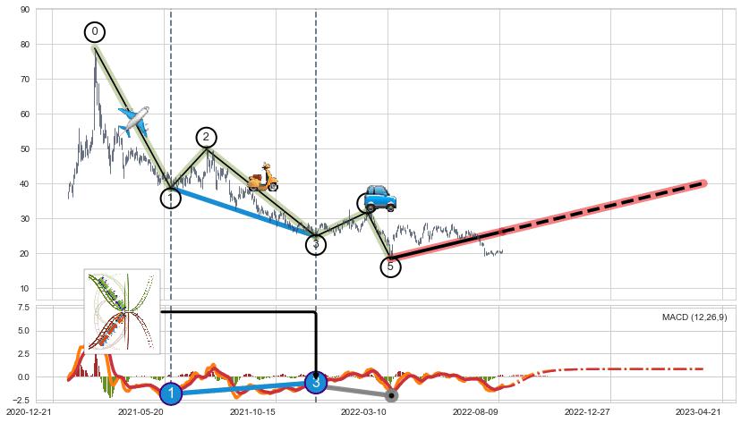 | 2 🅚:【高山滑雪】买入点 ➕ 🌊:波浪理论猜想下跌浪5已形成,猜想后续形成abc反弹上涨(均值回复) ☞ 看多信号 ⇥ 【均线】交织【图形】⇥ 综合量化分数: 54 | > |