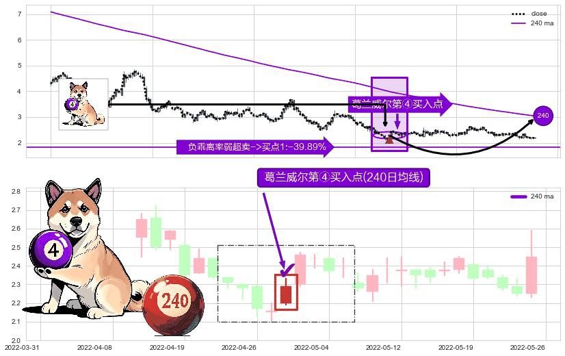 形态多维评估: ⚀ 2022-04-28-日显现 葛兰威尔均线 240日均线 第④买入点 下降趋势均值回复的短线反弹信号,后市看涨,买进信号