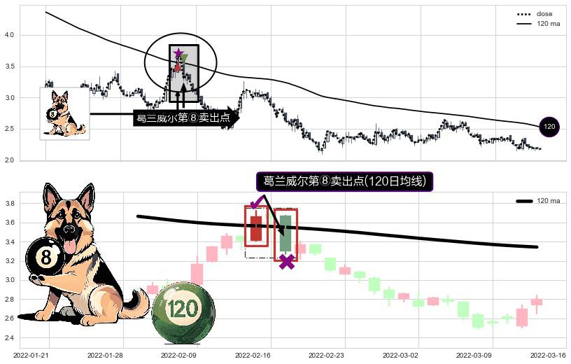 形态多维评估: ⚀ 2022-02-17-日显现 葛兰威尔均线 120日均线 第⑧卖出点 下降趋势的中继信号,后市看跌,卖出信号