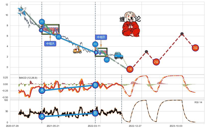 ➢ 【中枢B】:2022-01-31-2022-04-27,中枢由5笔构成,共57交易日, ZG=3.120, ZD=2.830