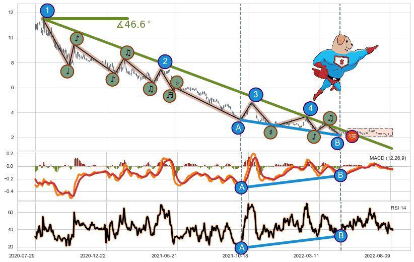 | 14 🅚:旭日东升 ➕ 🌊:波浪理论猜想下跌浪5已形成,猜想后续形成abc反弹上涨(均值回复) ☞ 看多信号 ⇥ 【🅚线】交织【图形】⇥ 综合量化分数: 55 | > |