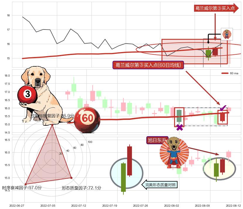 | 3 🅚:【金蜘蛛】买入点 ➕ 🌊:波浪理论猜想下跌浪5已形成,猜想后续形成abc反弹上涨(均值回复) ☞ 看多信号 ⇥ 【均线】交织【图形】⇥ 综合量化分数: 63 | > |