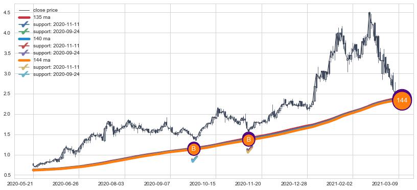 上涨趋势2020-05-21-2021-03-09,均线144, 140, 135确认关键支撑2处