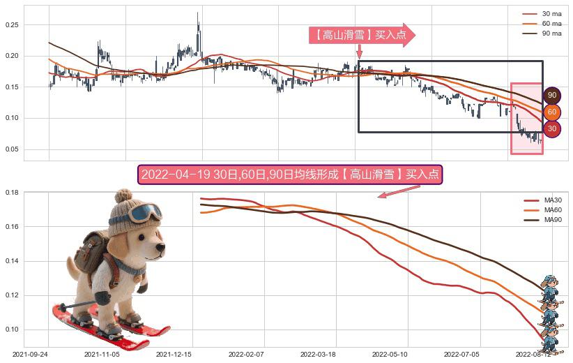 ⚀ 2021-12-22日-2022-08-12日显现 30日-60日-90日均线 【高山滑雪】买入点 看多信号,后市看涨,买入