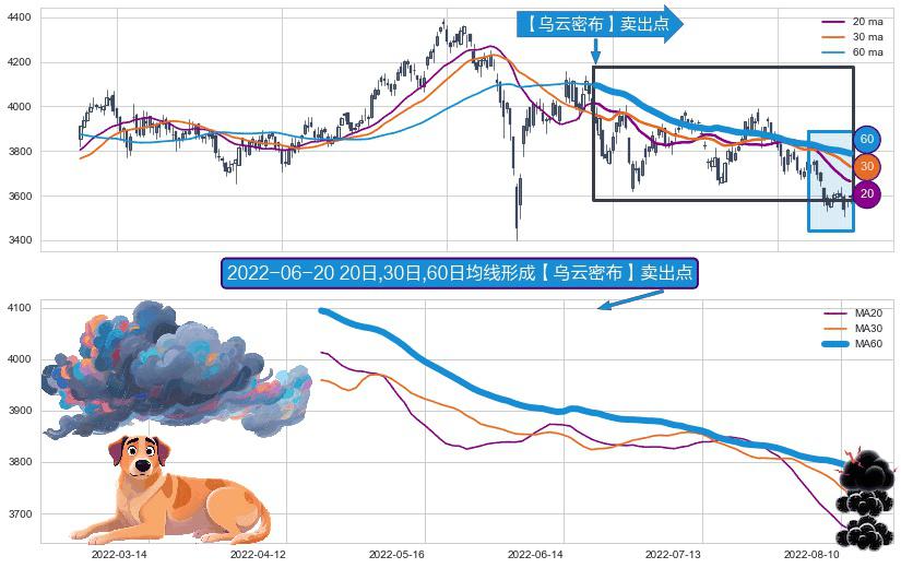 形态多维评估: ⚀ 2022-04-21日-2022-08-12日显现 20日-30日-60日均线 【乌云密布】卖出点 看空信号,后市看跌,卖出