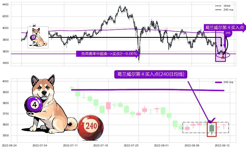 形态多维评估: ⚀ 2022-08-10-日显现 葛兰威尔均线 240日均线 第④买入点 下降趋势均值回复的短线反弹信号,后市看涨,买进信号