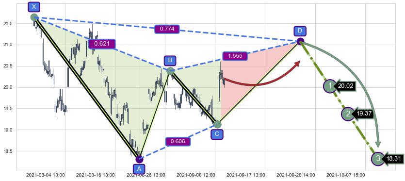 ➣ 谐波伽利:b下跌接近c:猜想支撑性拉升 → 上涨 →【拐点】支撑临近 → 大趋势均值回复