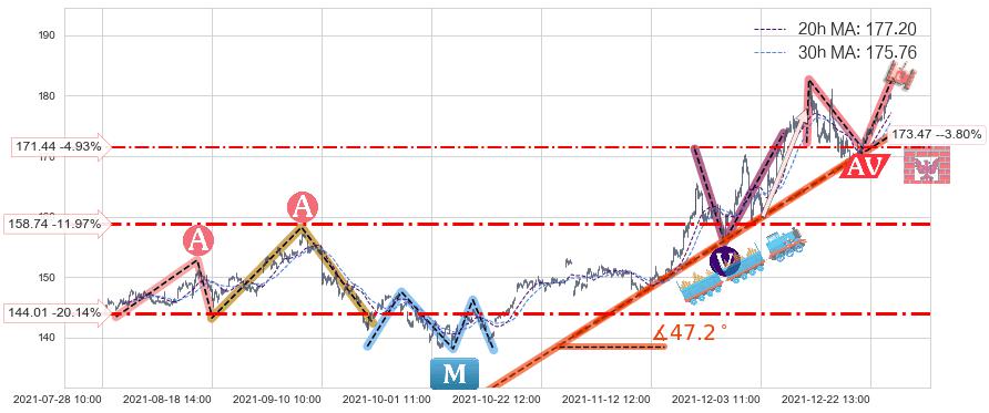 ♘ 支撑价格位171.44,可信任强度46.17%,距离最后交易2021-12-27 16:00形成的收盘价格180.33相差 -4.93%