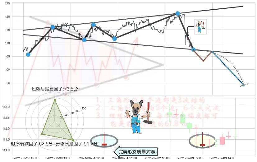 ➢ 下跌镊子线(n形磁铁) + 扩散三角反转临近支撑猜想转换阻力下跌信号叠加后【反向回撤率】低,【看空】信号叠加【存续影响大】