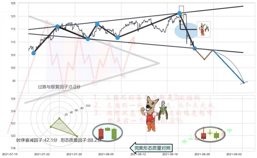 ➣ 下跌镊子线(n形磁铁) + 扩散三角反转临近支撑猜想转换阻力下跌信号叠加后【目标达成率】偏高,【看空】信号叠加【存续影响降权】