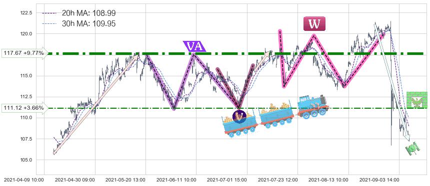 ♘ 阻力价格位111.12,可信任强度54.87%,距离最后交易2021-09-09 14:00形成的收盘价格107.20相差 +3.66%