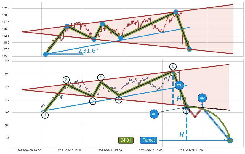➢ 最小反转跌幅→𝐇: 13.09 (逐步抬高阻力斜边最后的阻力点⑥与支撑边垂直距离)