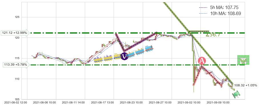♘ 阻力价格位121.12,可信任强度73.54%,距离最后交易2021-09-09 14:00形成的收盘价格107.20相差 +12.99%