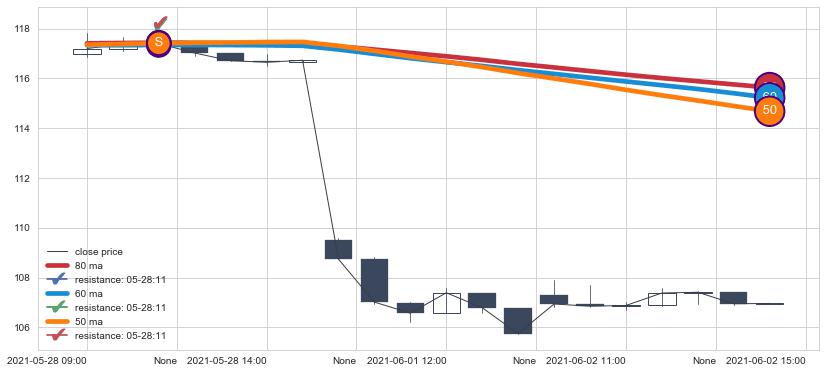 ➣ 70小时均线于(07-22 14:00: 118.23)形成【金叉】基于【金叉历史模型】预测金叉后最高波峰价格: 120.93, 金叉后最高价格129.46,已经上涨超出预测最高波峰价格, 预期回调